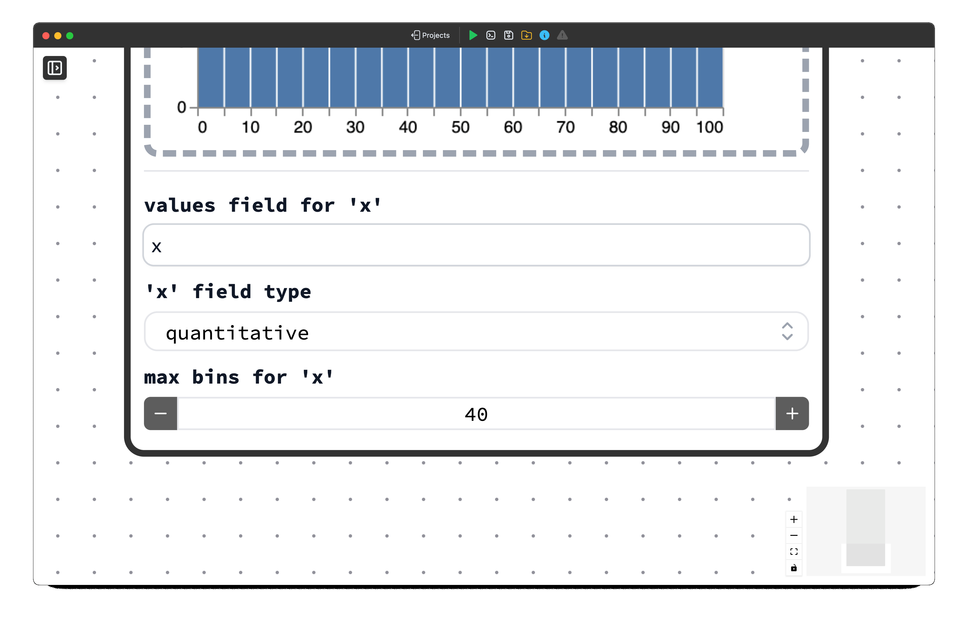 In our example, we used the Vega-Lite schema below, which is somewhat rigid: it expects a field named x