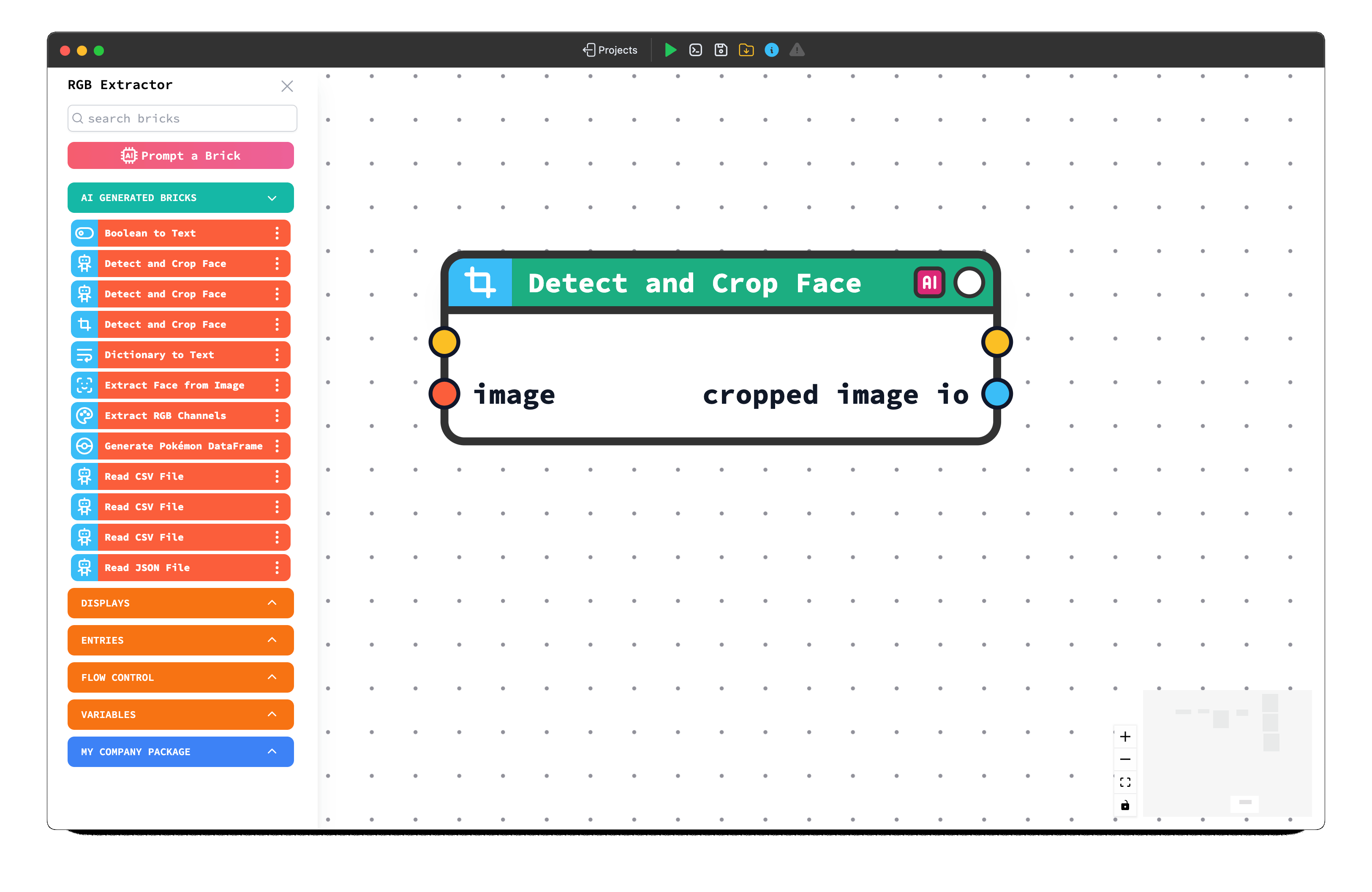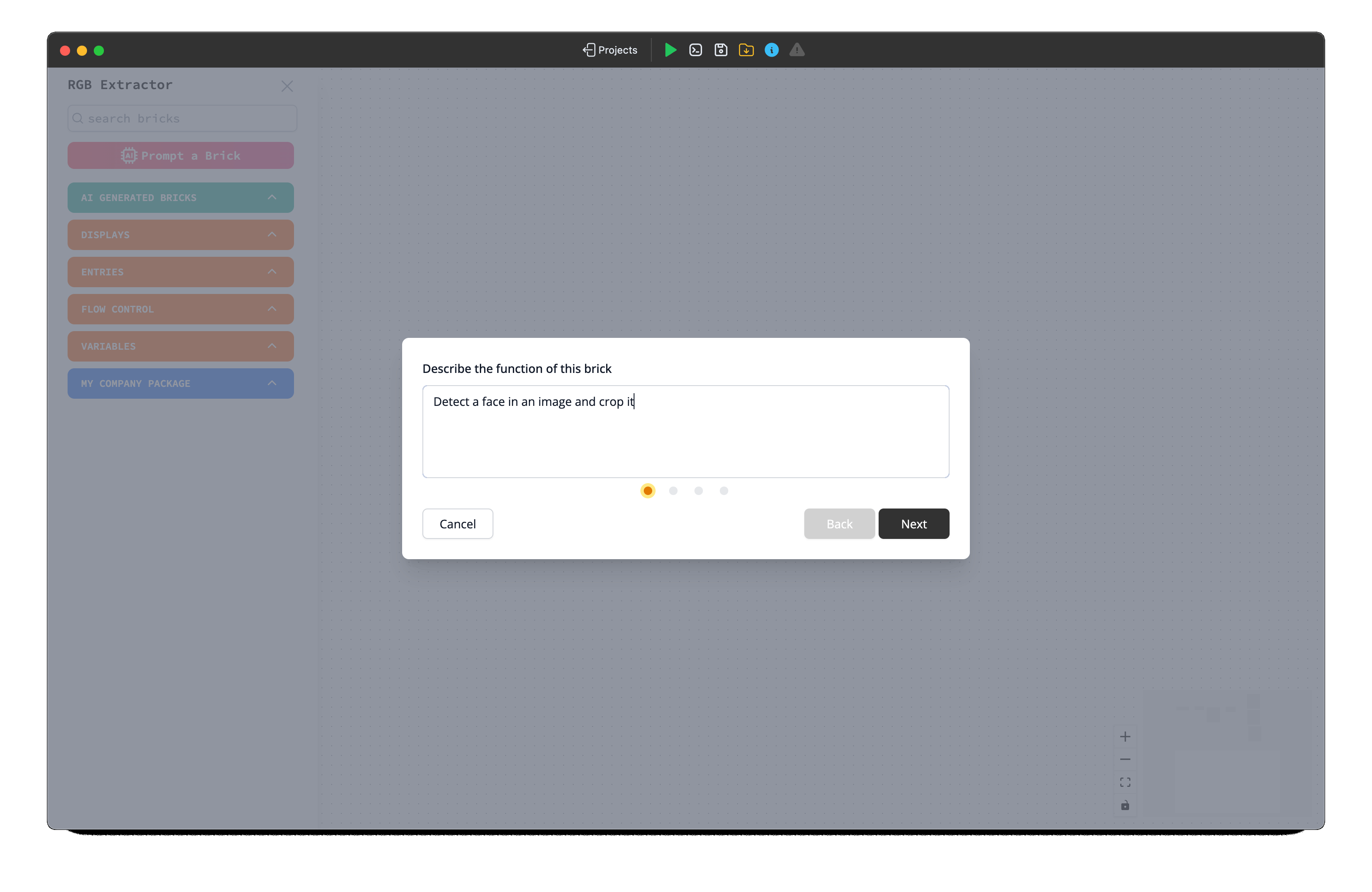 When the standard library of Bricks doesn't cover a specific processing need for your workflow, CODED FLOWS empowers you to leverage Artificial Intelligence to generate custom Bricks simply by describing them.