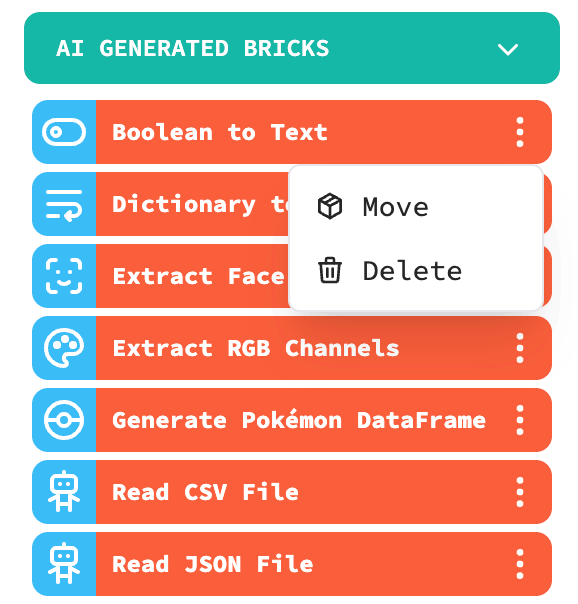 AI Generated Bricks). - Click the contextual menu button (often represented by three dots) next to the Brick's name.