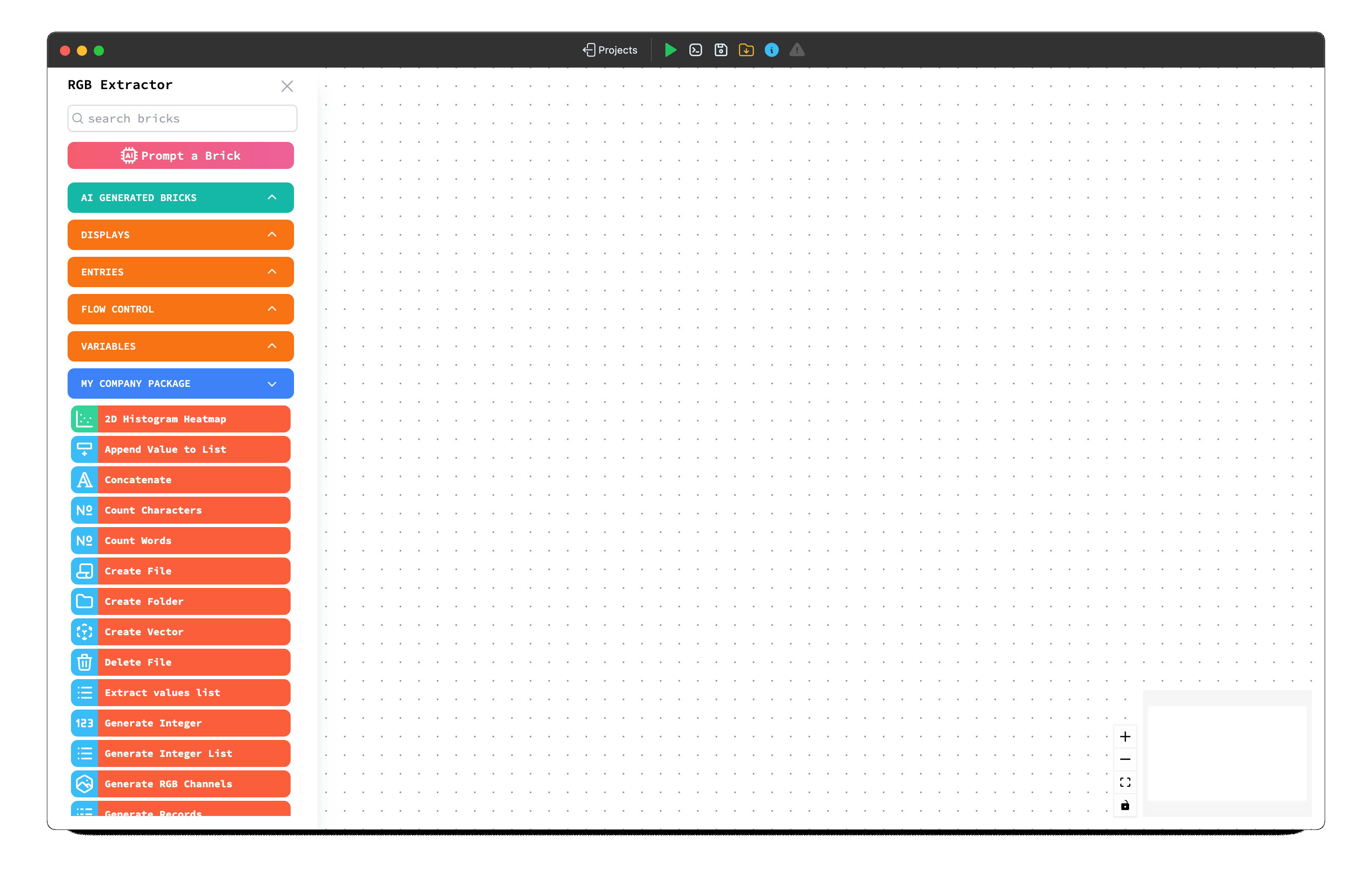 - Packages & Bricks: The sidebar lists available Packages (collections of related bricks). Click a package name to expand it and see the Bricks it contains.