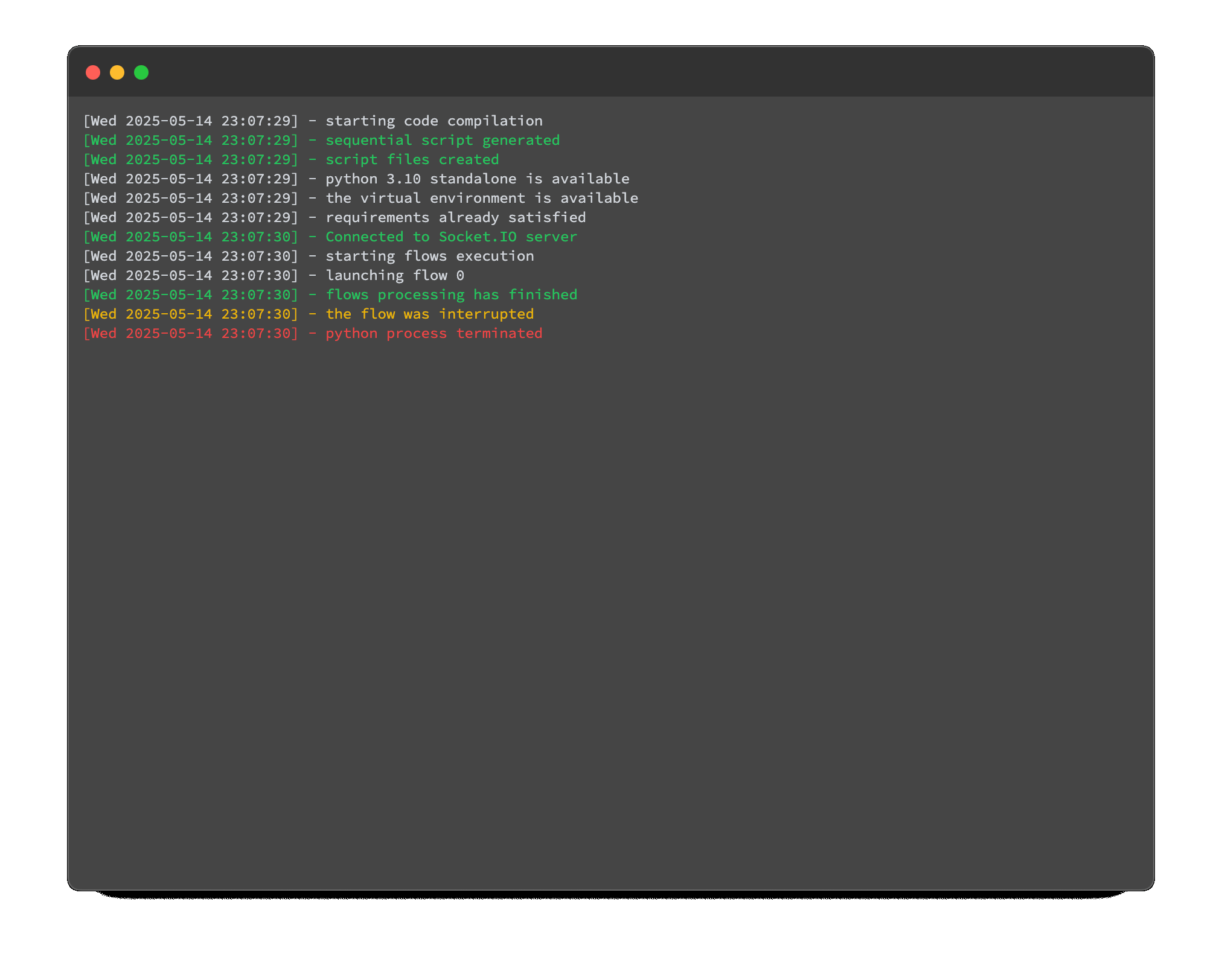 Monitor: Watch the Logs window. You should see messages indicating the start of the flow, the execution of each brick if they have any logs, and finally, a success message (or error details if something went wrong).