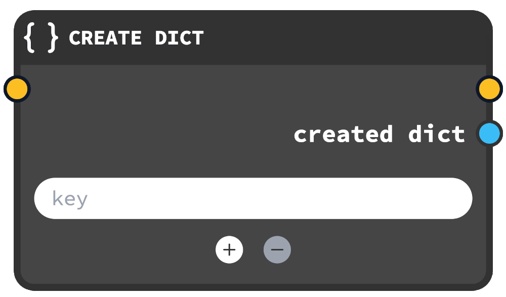 Creates a key-value dictionary by pairing named keys with their corresponding values. Key handles are labeled with descriptive names (e.g., "name", "age", "status") and connected to their respective value inputs. You can add a new key-value pair by clicking on the plus button.
