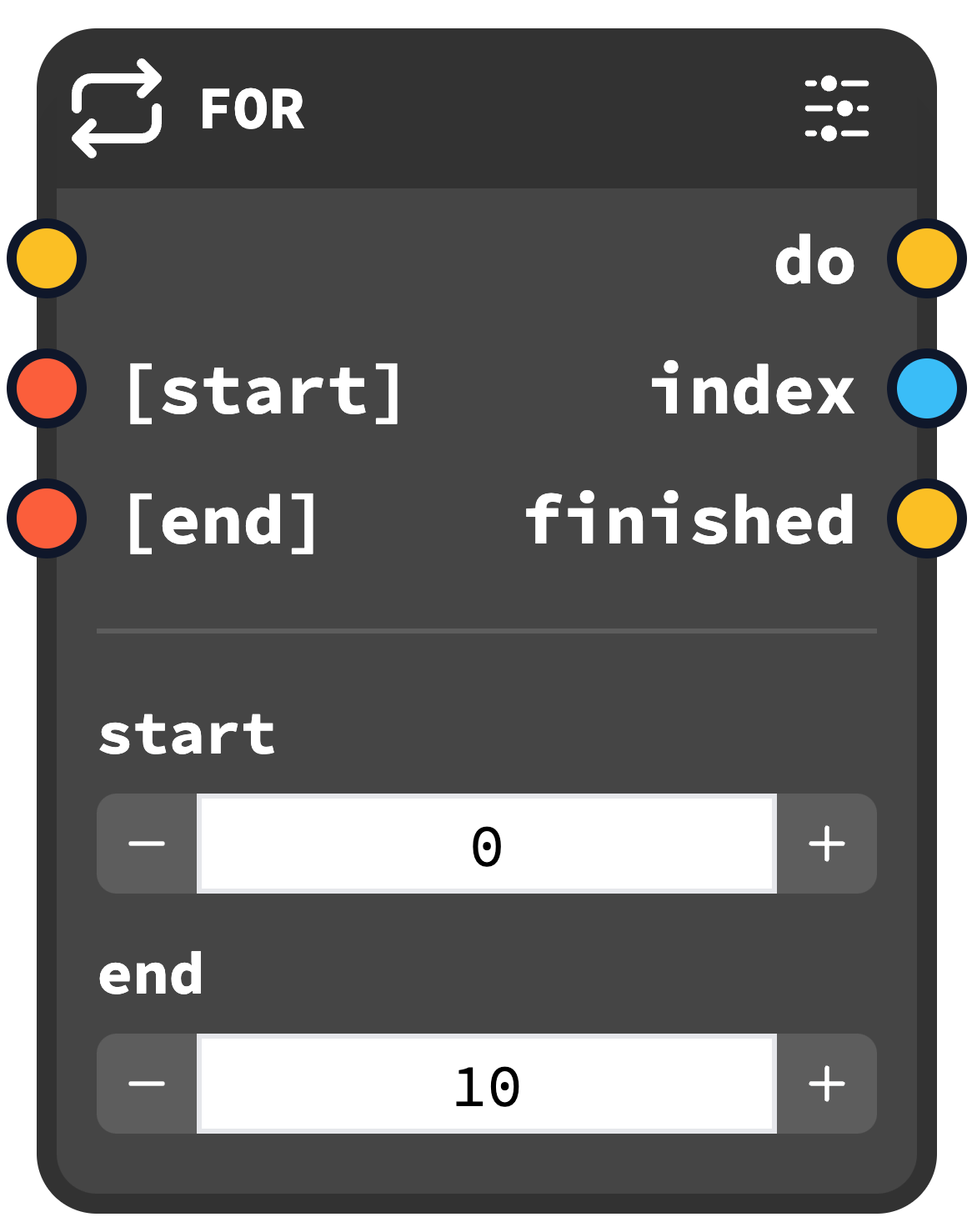 It repeats a task block over a specified range of indices, ideal for fixed iterations like processing a set number of items. It can derive indices from its inputs (start and end) or by defining their values in the options menu. It provides three outputs: the do trigger to specify the sub-flow to execute, index to access the current iteration number, and the finished trigger to specify a sub-flow to execute after the loop completes.