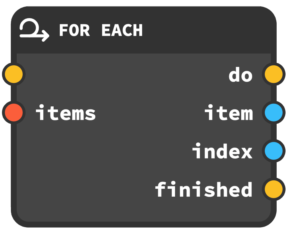 The FOR EACH Brick iterates over an iterable, processing each item individually. The list input expects an iterable collection, and it provides four outputs: the do trigger to specify the sub-flow to execute, index to access the current iteration number, item to return the current item of the iterable, and the finished trigger to specify a sub-flow to execute after the loop completes.