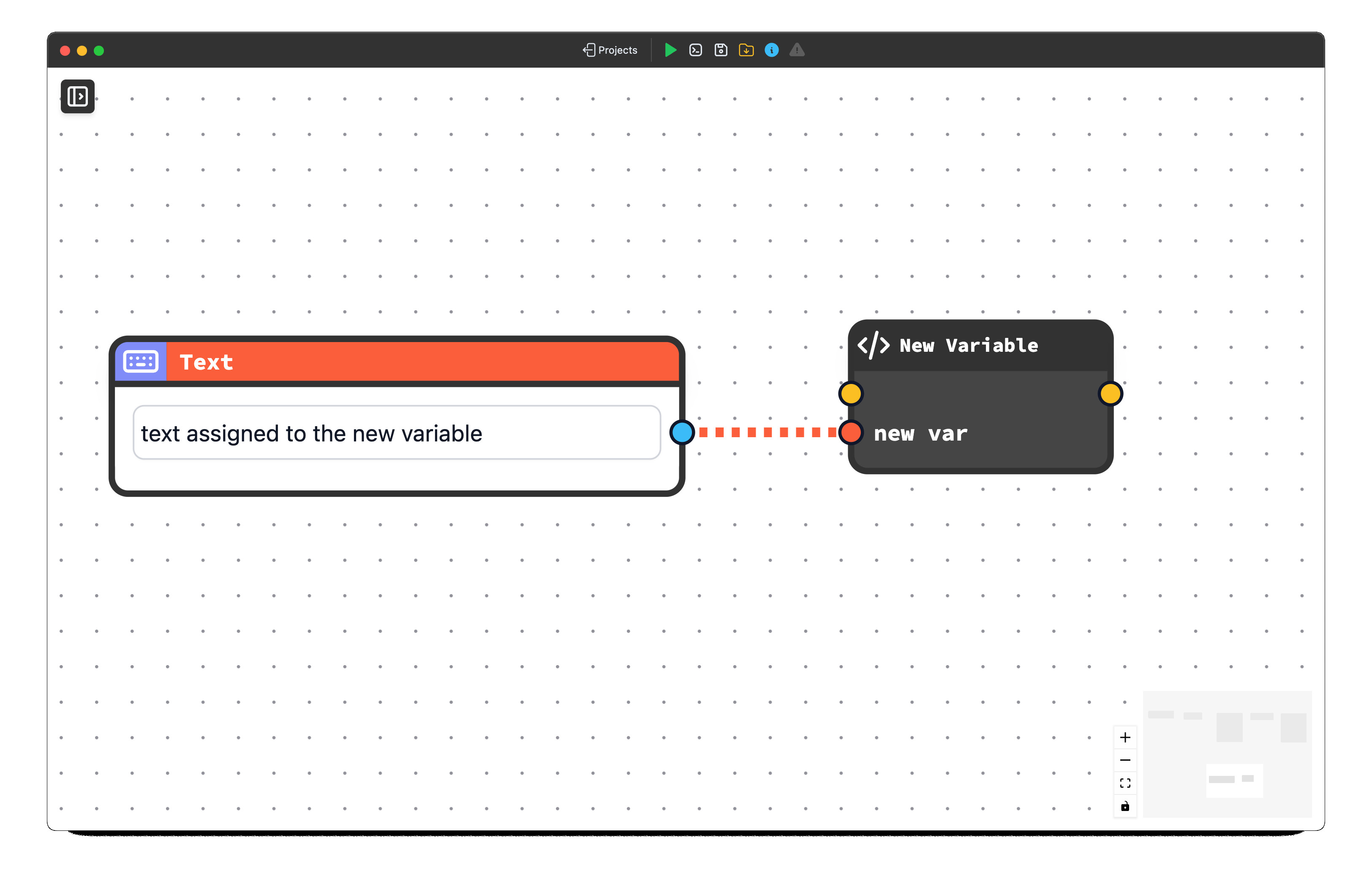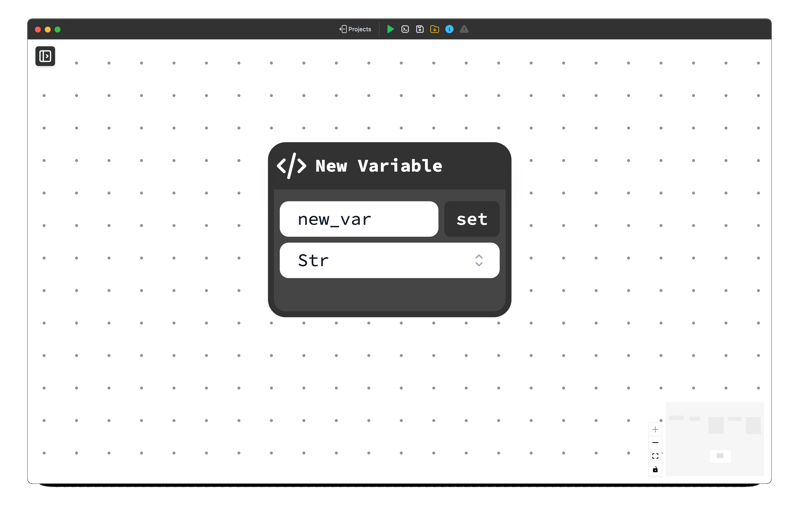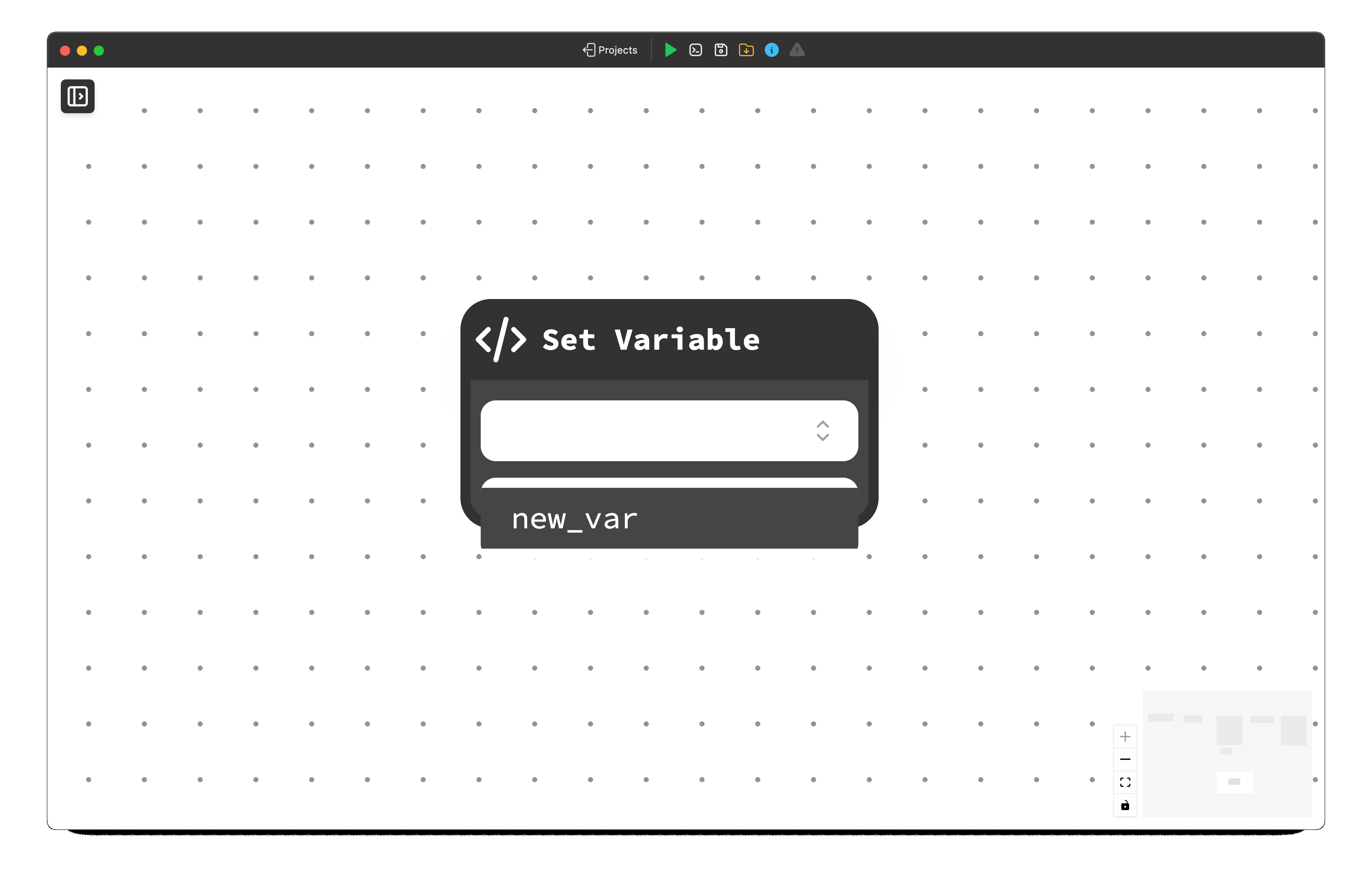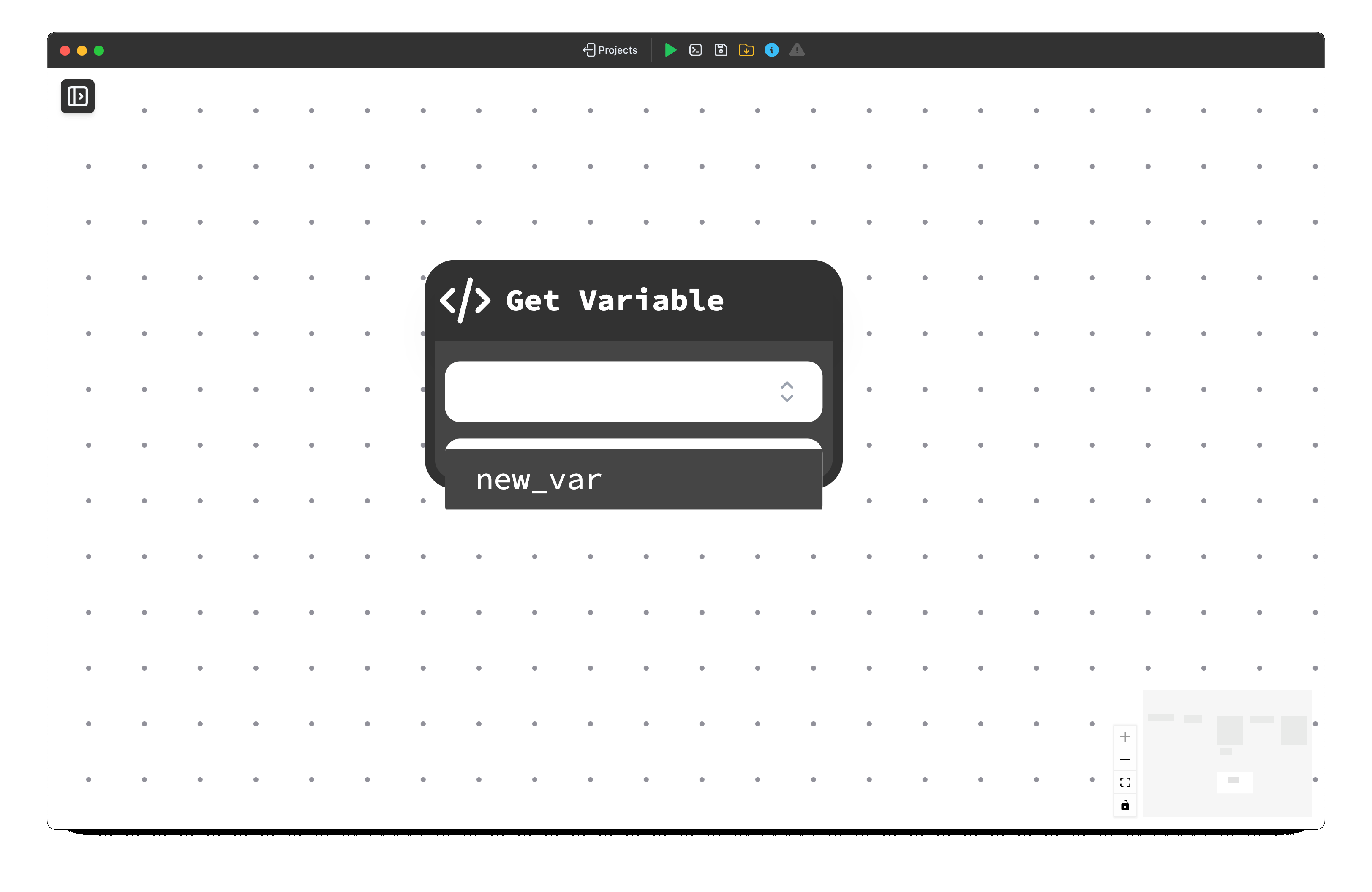 The New Variable brick allows users to create a new variable by specifying its name, data type, and initial value.