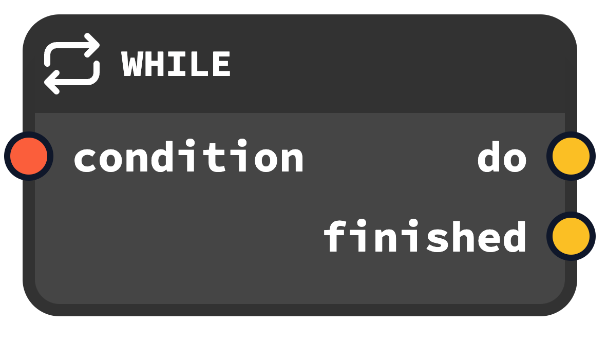 It repeats tasks while a condition remains true. It has two outputs: the do trigger to specify the sub-flow to execute and the finished trigger to specify a sub-flow to execute after the loop completes.