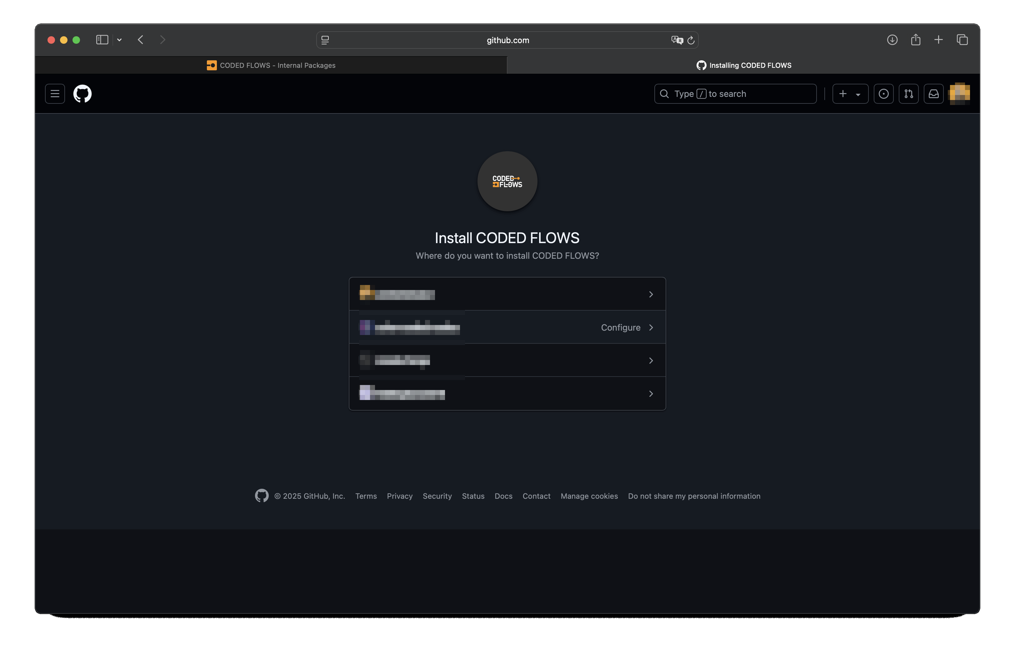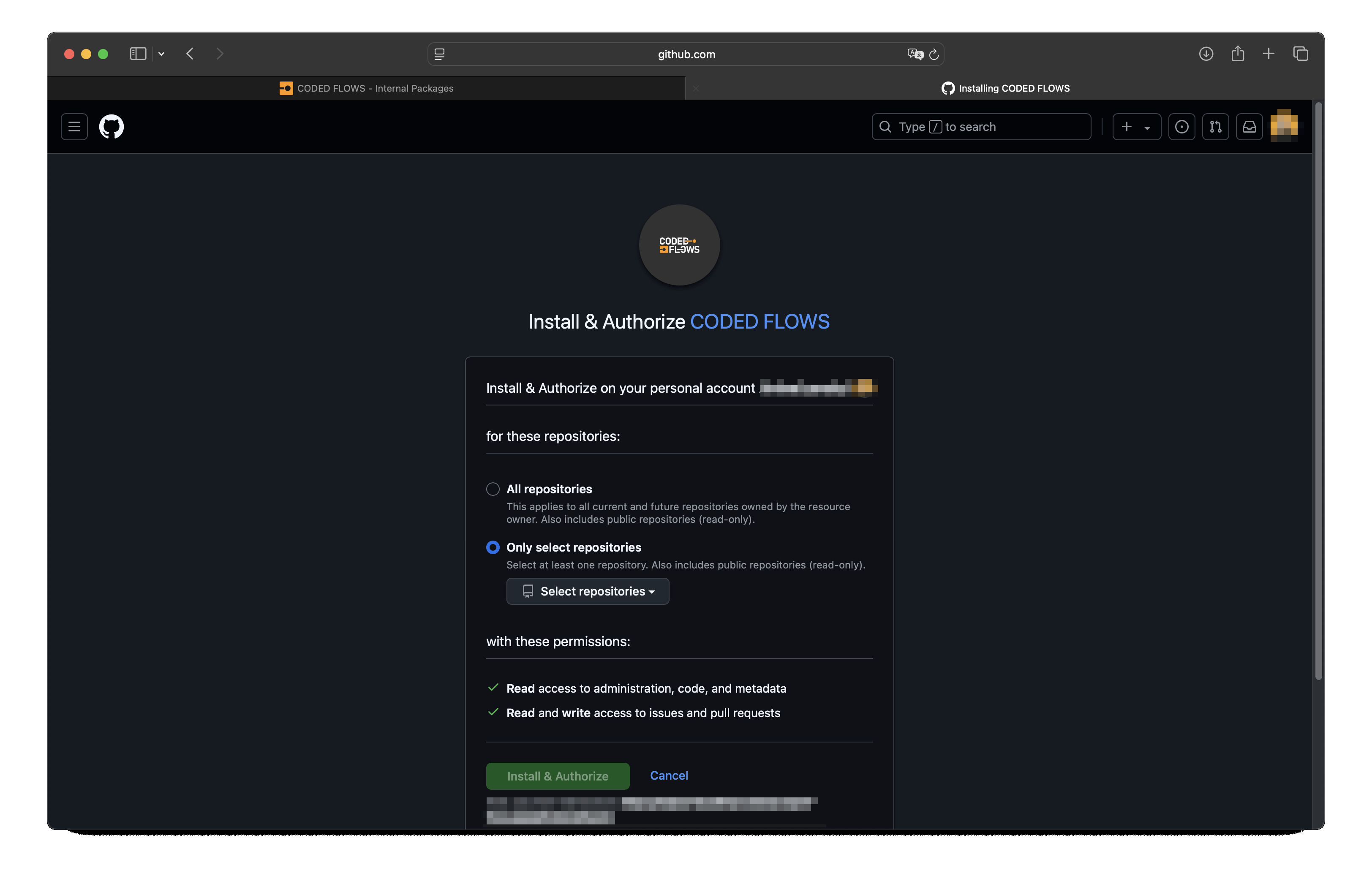 After clicking "Install Bot", you are redirected to GitHub to select where to install the CODED FLOWS bot.